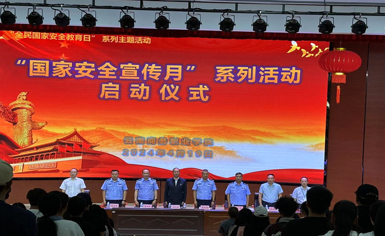 主题活动一:举行“国家安全宣传月”系列活动启动仪式:在嘹亮的国歌声中,学校“国家安全宣传月”系列活动启动仪式开始,云南省教育厅督导专员、学校党委书记张向英,嵩明县公安局国保大队大队长李金福,嵩明县反恐办副主任、国保大队副大队长章亚群,嵩明县公安局治安大队中队长申志,嵩明县公安局龙保派出所警官、法治副校长杨志刚,学校党委副书记郭新阳、副校长武绍宏、校长助理梁屯等领导出席仪式。学校有关职能部门负责人,各二级学院院长或副院长,教师代表和学生代表共计450人参加系列教育活动。启动仪式由武绍宏副校长主持,按照活动议程,组织观看了国家安全专题宣传片《这十年》,郭新阳副书记发出了维护国家安全倡议,学生代表杨德娃就国家安全教育进行发言,嵩明县公安局国保大队李金福大队长讲话并提要求,学校张向英书记宣布“国家安全宣传月”系列活动启动,正式拉开了学校“国家安全宣传月”系列活动的序幕。
