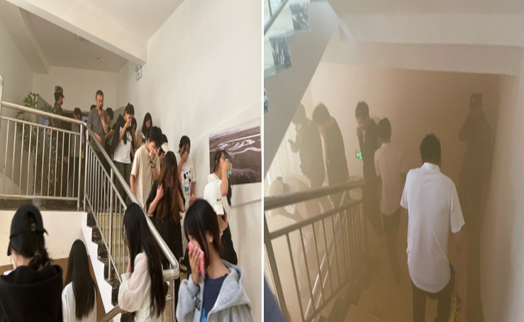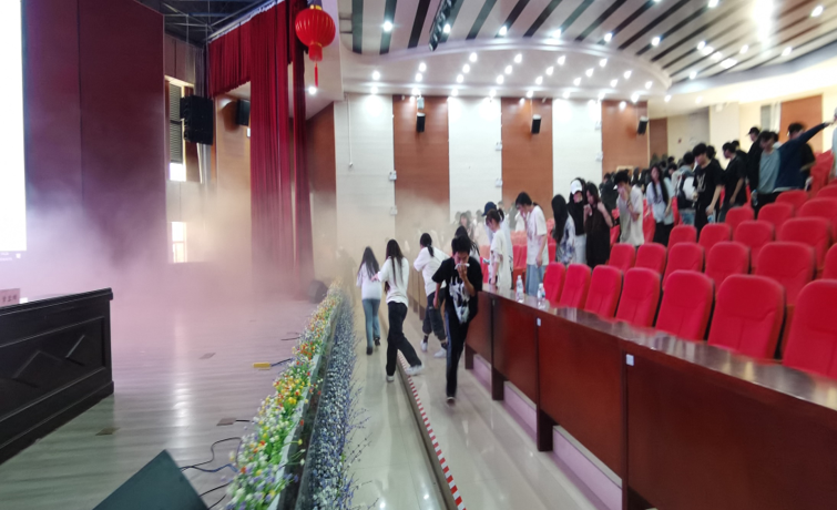 主题活动三:组织应急疏散演练:预设火灾条件下的应急疏散,疏散前,安稳处带领师生重温应急疏散要领,随即在浓烟迷雾中拉开应急疏散演练。在疏散安全引导员的指引下,参加讲座的全体师生手拿毛巾捂住口鼻,从最近出口选择逃生路线,有序疏散到室外指定位置,并清点疏散人数和集中讲评。通过此次活动,在模拟真实的烟雾场景下,以亲身体验传播应急知识,不断提高师生应急响应、安全疏散、逃生自救能力。