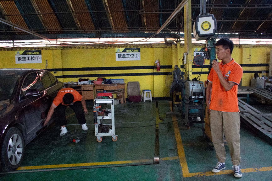 汽修班的同学在我们来到的时候都一直在忙,忙着给车进行美容保养和维修, 在某些同学有空闲时间时进行了采访:“请问这位同学对于初次进行工学交替你最大的收获是什么?”20级综合班张厚敏回答说:“对于我来说的话,可能最大的收获就是学习环境的不同,让我克服了在学校的懒惰心理,来到公司之后的话跟学校最大的不同就是生活上充实了很多”。18级汽修班王志华回答说:“在企业没有人去约束你全靠自己,而在学校有同学有老师的约束有同学在说你有老师在管你,来到企业之后全靠自己自觉,细节很多,做错事情就是挨骂”。此次采访也由负责带队的赵必俊老师给我们大家进行介绍同学们平时的学习情况和表现,赵必俊老师也一一给我们介绍了机修、漆工、铜工、美容工位学生的具体工作。同时显而易见地是无论什么岗位的学生们都在认认真真的完成自己的工作,将云商“博修商道,崇德务实”的校训践行到底。