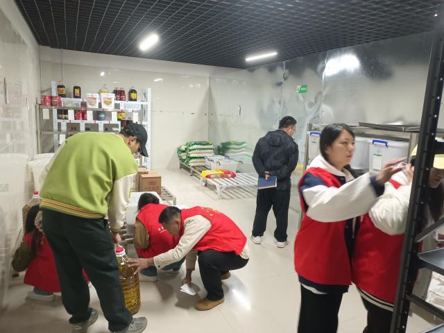 在食堂的志愿者们检查了食材的新鲜度、储存情况以及厨房的卫生状况。他们仔细查看了米面粮油等大宗食材的生产日期和储存环境,确保没有过期或变质的情况发生。同时,志愿者还关注了厨房工作人员的操作规范,比如是否佩戴口罩、帽子,以及是否按照要求进行手部清洁。